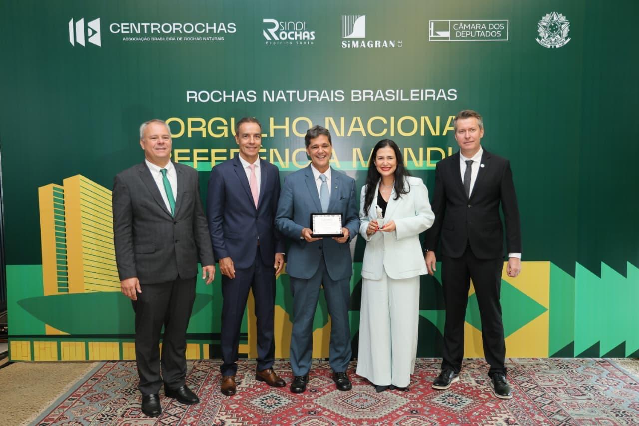 O vice-governador do Estado do Espírito Santo, Ricardo Ferraço, foi homenageado nesta quarta-feira (11) na Sessão Solene ao Setor Produtivo de Rochas Naturais do Brasil. Também foram homenageados a empresa Imetame Logística, a agência ApexBrasil e a Agência Nacional de Mineração.